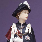 英国女王(在位1952〜)。 ジョージ6世の第1王女で、1952年父王の死により王位につきました。1975年(昭和50)には初めて日本を訪問しています。チャールズ王子・アン王女・アンドリュー王子・エドワード王子の3男1女の母親でもあります。 エリザベス1世像とともに、ロナルドの代表作として名高い逸品です。 |
